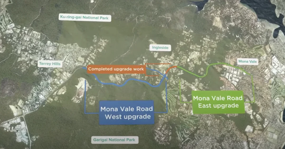 The planned works will upgrade 3.4 kilometres of Mona Vale Road between McCarrs Creek Road in Terrey Hills and Powderworks Road in Ingleside, expanding the road from two to four lanes. Key elements include a new signalised intersection at Kimbriki Road with turning lanes and a truck climbing lane. The Tumburra Street intersection will shift about 40 metres west with left-in, left-out access, while the Addison Road intersection will be restricted to emergency vehicles.
